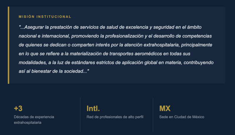 El Consejo Mexicano de Aeromedicina Extrahospitalaria esta conformado por profesionistas, expertos en la materia que han trabajado por más de tres décadas en el entorno extrahospitalario, desde el nivel operativo en campo, hasta el nivel estratégico en el contexto de la gestión directiva de instituciones de salud.